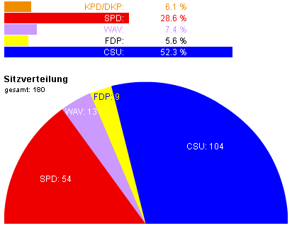 Bei den ersten Landtagswahlen erzielt die CSU mit 52,3% der Stimmen (104 Mandate) einen deutlichen Erfolg. Die SPD erreicht 28,6% (54 Mandate), die WAV 7,4% (13 Mandate), die KPD 6,1% und die FDP 5,6% (9 Mandate). Die KPD ist nicht im Parlament vertreten, da sie an der Zehnprozent-Hürde auf Wahlkreisebene scheitert.