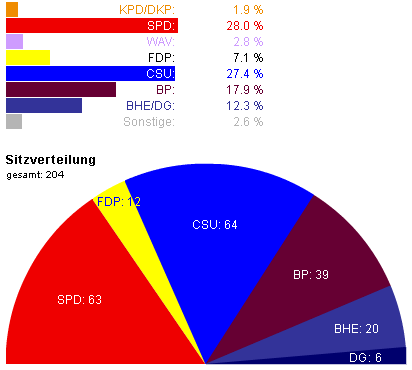 Die SPD erreicht mit 28% die meisten Stimmen, erhält aber wegen einiger Überhangmandate für die CSU einen Sitz weniger als diese (63). Auch die kleineren Parteien legen zu: Der BHE/DG (Block der Heimatvertriebenen und Entrechteten/Deutsche Gemeinschaft) erzielt 12,3% Stimmenanteil (26 Mandate), die FDP 7,1% (12 Mandate). WAV und KPD sind mit 2,8% bzw. 1,9% nicht mehr im Landtag vertreten.