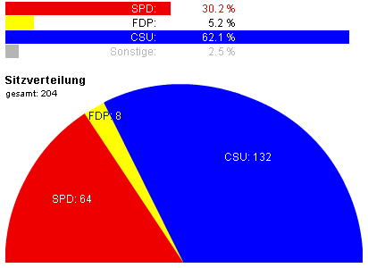 Bei der Landtagswahl am 27. Oktober 1974 erzielt die CSU einen geradezu sensationellen Wahlerfolg: 62,1% der Stimmen und 132 Mandate bedeuten fast zwei Drittel der Sitze im Parlament. In der Landeshauptstadt München kommt der Sieg der CSU einem politischen "Erdrutsch" gleich: Sie nimmt den Sozialdemokraten alle elf Direktmandate ab. Die SPD verliert 3,1 Prozentpunkte und erreicht 30,2% (64 Mandate), die FDP schafft mit 5,2% gerade noch den Sprung ins Parlament, hat aber mit jetzt acht Mandaten keinen Fraktionsstatus mehr.