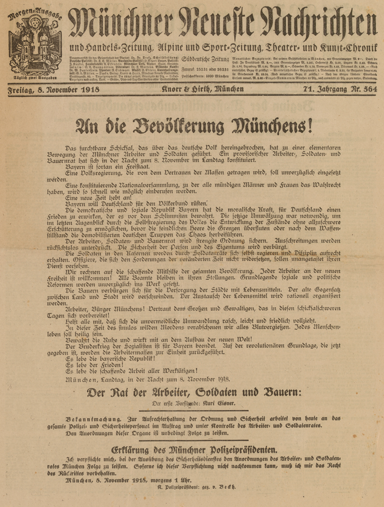 Am 7. November 1918 rief Kurt Eisner die Republik, den Freistaat Bayern, aus. Damit war die Monarchie beendet. König Ludwig III. entband am 13. November 1918 Beamte, Soldaten und Offiziere von ihrem Eid, dankte jedoch nicht offiziell ab. Die Aufgabe des vorläufigen Parlaments übernahm der Provisorische Nationalrat, Kurt Eisner wurde Ministerpräsident.