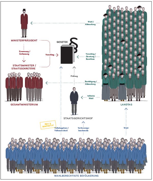 Am 12. August 1919 wurde die nach dem Entstehungsort benannte „Bamberger Verfassung“ angenommen. Bayern war nun eine parlamentarische Demokratie. Wahlberechtigt waren jede Bürgerin und jeder Bürger ab 21 Jahren. Das Volk übte seine Rechte durch das Parlament und mittels Volksbegehren und Volksentscheid aus. Die Verfassung sah darüber hinaus einen starken Landtag vor, der unter anderem zuständig war für die Gesetzgebung, die Genehmigung aller Staatsverträge, die Bewilligung der staatlichen Einnahmen und Ausgaben sowie für die Wahl und Abberufung der Regierung bzw. ihrer Mitglieder. Der Ministerpräsident hatte dagegen in der Regierung eine vergleichsweise schwache Stellung.