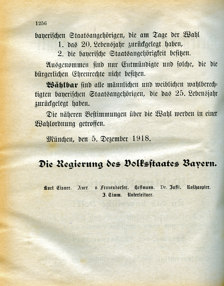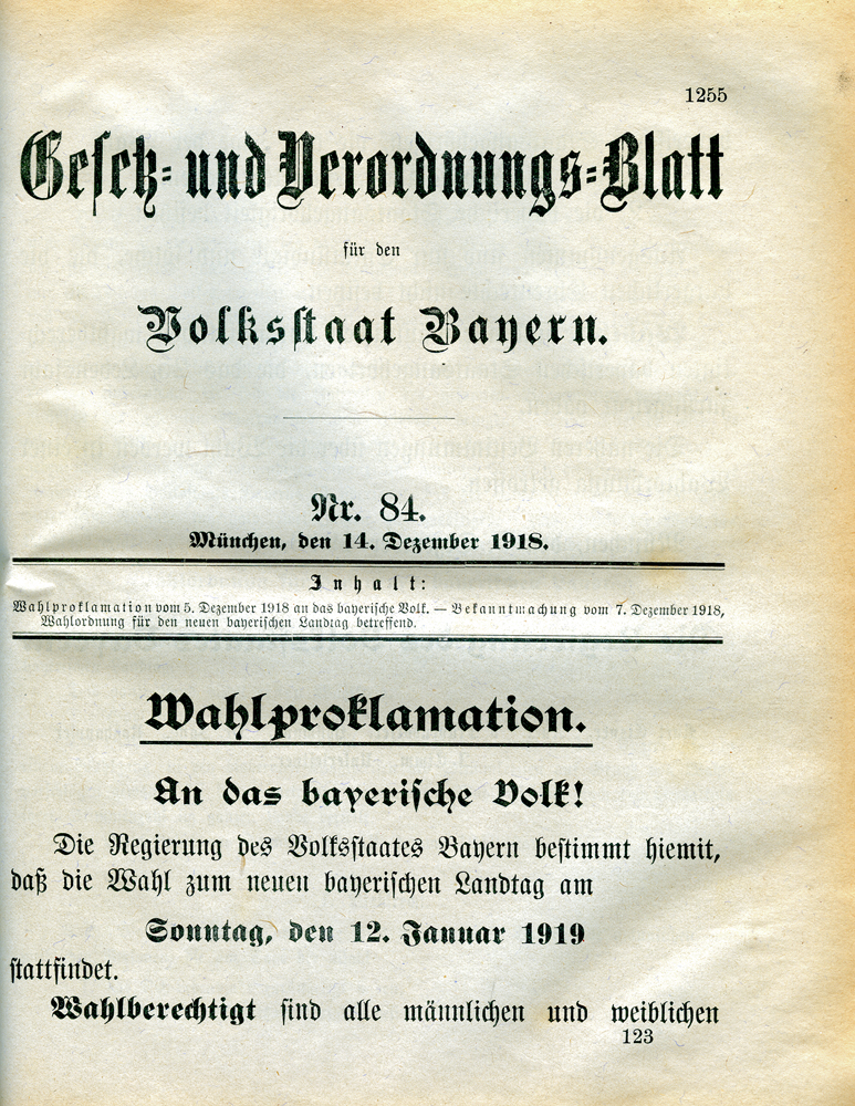Am 12. Januar 1919 wurde dann der Bayerische Landtag gewählt. Erstmals existierte damit eine demokratisch gewählte Volksvertretung in Bayern, die über eine neue Verfassung beraten sollte. Nach der Ermordung Eisners und dem Ende der Räterepublik in München bildete schließlich die SPD unter Ministerpräsident Hoffmann am 31. Mai 1919 eine Koalitionsregierung mit der BVP und der DDP.