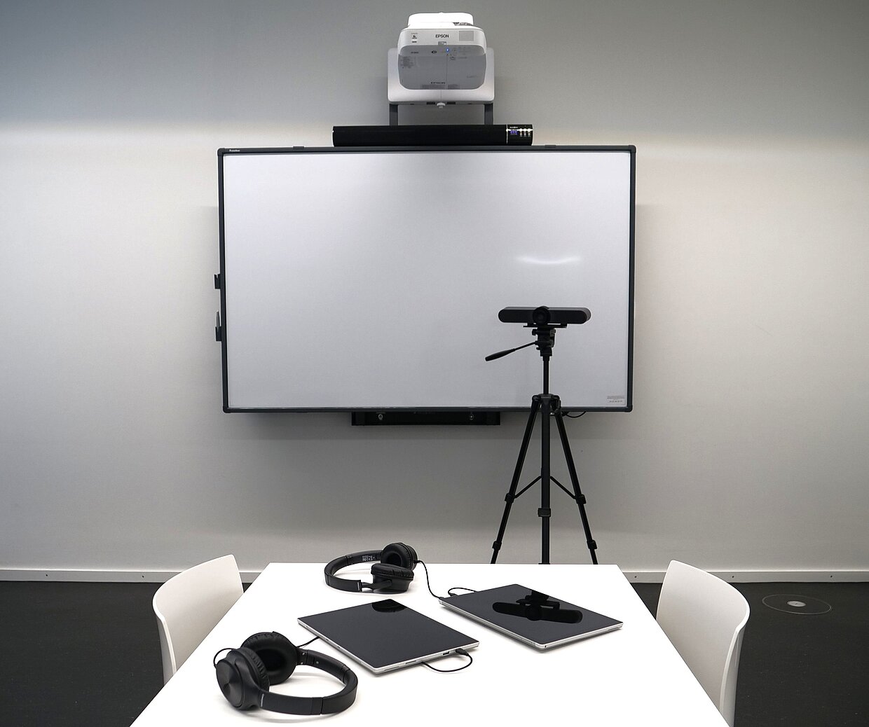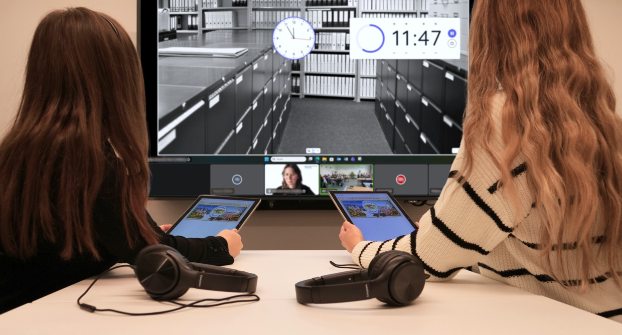 - Der Beamer wird mit einem Gerät verbunden, das Kamera, Mikrofon und Lautsprecher besitzt. Darüber nimmt die Klasse an der Videokonferenz teil.